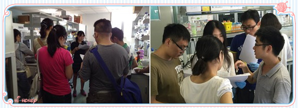 收集好血液樣本后, 每個小組根據(jù)protocol開始實驗操作,指導(dǎo)人員對關(guān)鍵步驟進行說明并進行演示,如加樣,溶紅,加抗體混勻,洗滌,避光孵育等步驟。