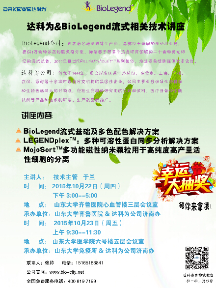 10月22日至23日,分別由山東大學(xué)齊魯醫(yī)院 、山東大學(xué)免疫所和達(dá)科為生物濟南辦共同承辦的流式專家講座,在山東大學(xué)齊魯醫(yī)院心血管三樓會議室和六號樓五層會議室如期舉行。