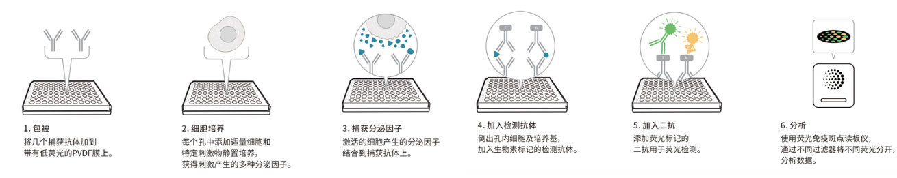 相比于ELISpot,F(xiàn)luoroSpot依舊維持了ELISpot的高靈敏度,還能對單細(xì)胞分泌的多種細(xì)胞因子同時進(jìn)行檢測,從而實(shí)現(xiàn)細(xì)胞亞群的鑒定和細(xì)胞多功能性分析。