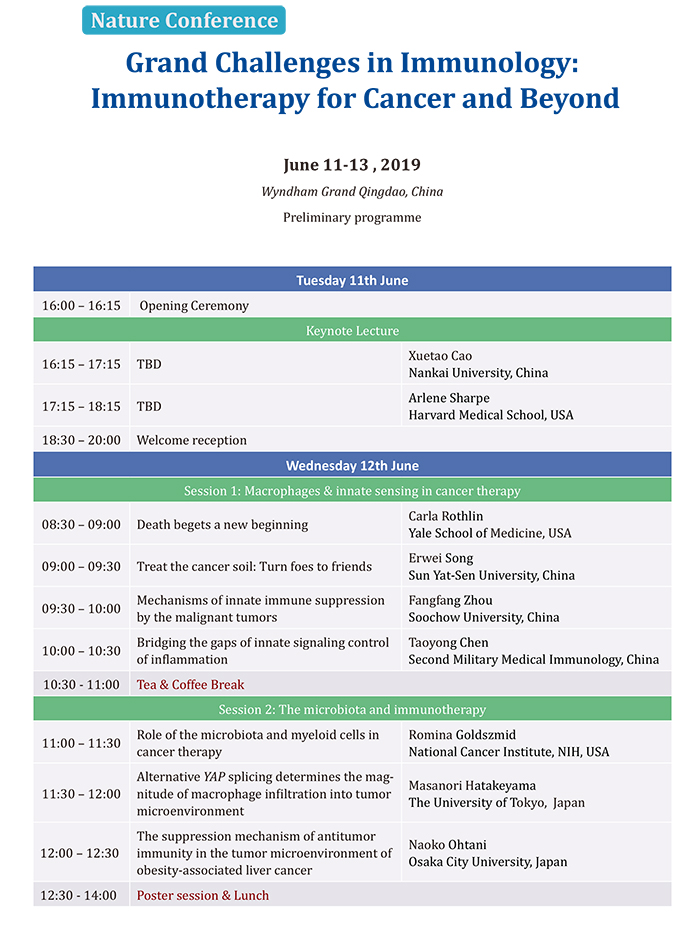 此會議是以《Nature Immunology》、《Nature Review Immunology》、《Nature》和《Cellular &Molecular Immunology》四本國際頂級免疫學期刊為交流平臺,以促進國際免疫學家交流為主旨的學術會議,自2009年起本系列會議啟動召開,現(xiàn)已成功舉辦六屆會議。