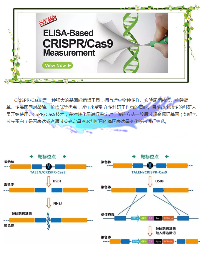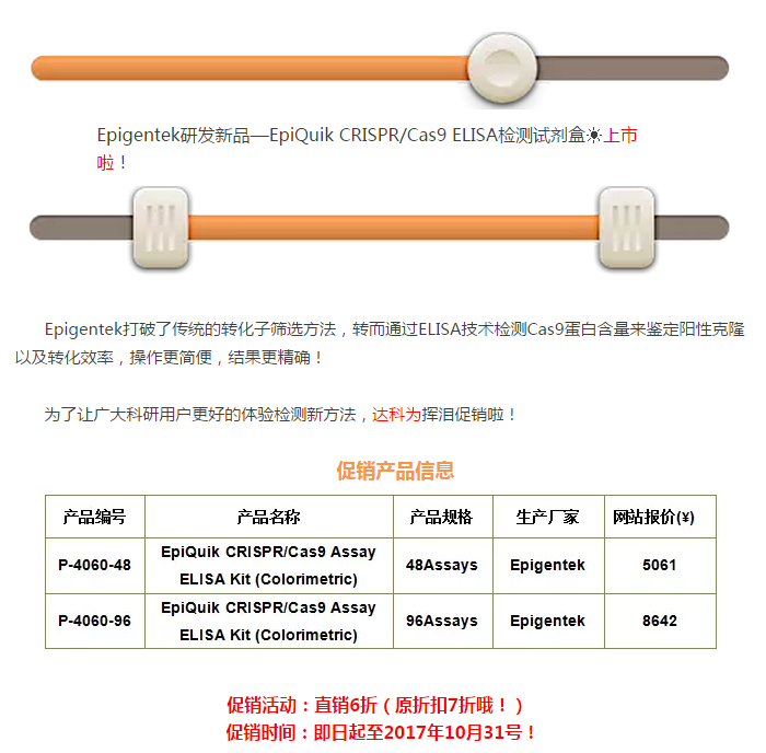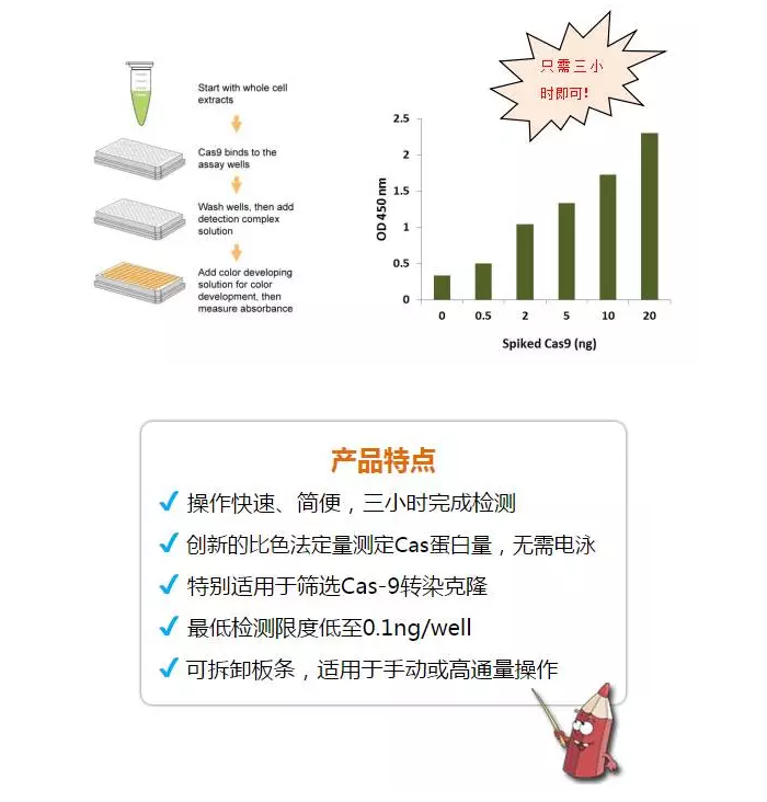 傳統(tǒng)方法操作復(fù)雜、花費(fèi)大量時(shí)間與精力,針對這個(gè)特點(diǎn),Epigentek研發(fā)出了通過ELISA檢測Cas9蛋白含量,進(jìn)而篩選轉(zhuǎn)化子的檢測試劑盒。該試劑盒僅需要純化的Cas9 核酸酶和全細(xì)胞提取物(分離自各物種的組織和培養(yǎng)的細(xì)胞),就能夠特異性定量檢測CRISPR相關(guān)蛋白9(Cas9,dCas9)。