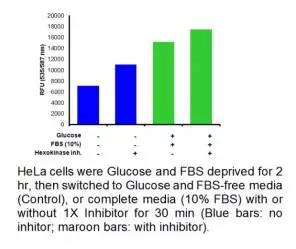 BioVision EZCellTM Glucose Uptake Assay kit 是一種簡(jiǎn)單而超級(jí)靈敏、易用的葡萄糖攝取檢測(cè)試劑盒。試劑盒利用一種特殊的己糖激酶抑制劑抑制己糖激酶,己糖激酶是糖代謝過(guò)程中涉及到的第一個(gè)酶,在葡萄糖被細(xì)胞攝取后,可捕獲葡萄糖。 葡萄糖攝取是利用一系列酶反應(yīng)檢測(cè)的,被氧化的葡萄糖產(chǎn)生的中間產(chǎn)物可以與OxiRed?探針反應(yīng)而發(fā)出熒光信號(hào)(Ex/Em=535/587 nm) 。熒光信號(hào)量直接反應(yīng)細(xì)胞所攝取和積累的葡萄糖。不像其他試劑盒是直接檢測(cè)葡萄糖衍生物,BioVision 提供了一種直接而強(qiáng)大的葡萄糖研究工具,可用于篩選和表征葡萄糖攝取相關(guān)疾病的藥物。