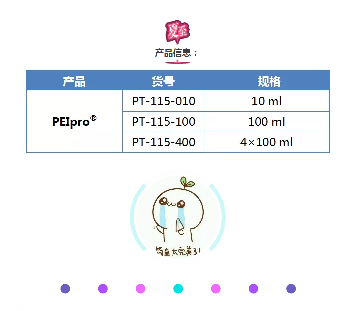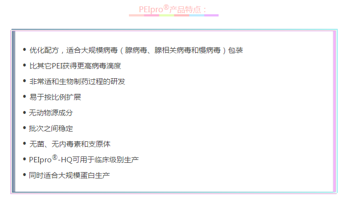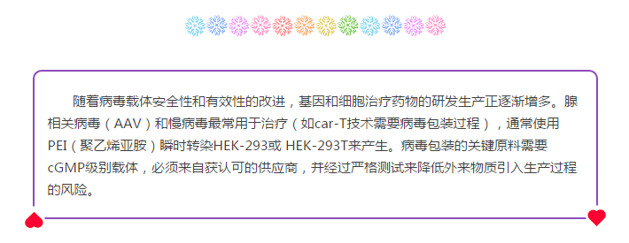 法國Polyplus推出科研級(jí)PEIpro?和臨床級(jí)PEIpro?-HQ,基于PEI的高品質(zhì)轉(zhuǎn)染試劑,助力car-T技術(shù)研發(fā)和cGMP生物制品的生產(chǎn)應(yīng)用。