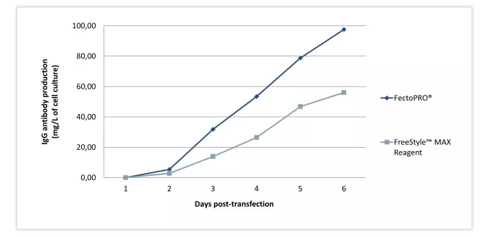 圖1. FectoPRO?大幅提高懸浮CHO細(xì)胞的抗體產(chǎn)量。按1×106個(gè)細(xì)胞/ml的密度將細(xì)胞培育在30ml的無血清培養(yǎng)基中,并依照每種試劑說明書推薦用量FectoPRO?(0.8 μg DNA/ml)或FreeStyle?MAX試劑(1.25 μg DNA/ml)進(jìn)行轉(zhuǎn)染。用蛋白質(zhì)G生物感應(yīng)器(fortéBIO? octet RED96 system)對(duì)重組小鼠IgG的產(chǎn)量監(jiān)測(cè)1~6天?!狿roteoGenix SAS(法國(guó))提供的數(shù)據(jù)。