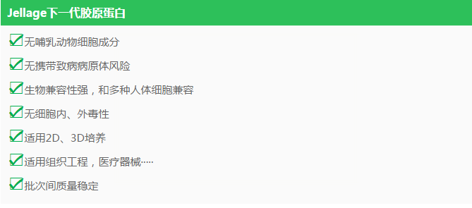 膠原蛋白是一種組成細胞外基質(ECM)關鍵的蛋白質,膠原蛋白由三條高度保守的α-螺旋多肽鏈組成。英國Jellagen提供的下一代Collagen(膠原蛋白)源于水母,兼有Type I和Type II膠原蛋白的活性。良好的膠原蛋白強度和彈性,使其適用于2D和3D細胞培養(yǎng)、組織工程以及醫(yī)療儀器。Jellagen生產的膠原蛋白由于其低免疫源性和低病原污染性,有著良好的組織兼容性,在創(chuàng)傷修復和組織工程學領域有很好的應用前景 Why Jellyfish!