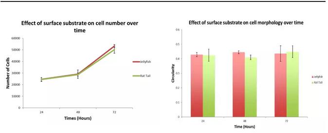 細胞培養(yǎng)72h結果顯示,在水母膠原(紅)上生長的細胞與在大鼠尾膠原(綠)上生長的細胞,細胞增殖水平和細胞形態(tài)接近。Jellagen是哺乳動物膠原蛋白良好的替代物。