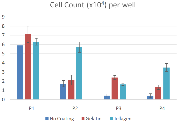 Jellagen膠原蛋白不僅具有良好的細胞兼容性、細胞粘附性,還可以為細胞提供充分的營養(yǎng)。在基質支持軟骨細胞生長過程中,Jellagen膠原上生長的軟骨細胞同在牛明膠上生長的軟骨細胞比較,細胞在P4時存活率更高。