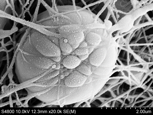 水母膠原蛋白經靜電紡絲技術生產出的納米纖維墊,軟骨細胞嵌入100nm-200nm纖維叢中。該纖維與天然細胞外基質(ECM)相當,表明Jellagen膠原蛋白納米纖維提供了細胞生長理想的環(huán)境。