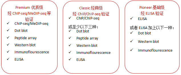 自2004年以來,Diagenode就與領(lǐng)先的表觀遺傳學(xué)專家和表觀遺傳學(xué)聯(lián)盟合作生產(chǎn)、驗(yàn)證包括抗體在內(nèi)的表觀遺傳學(xué)試劑。2012年,Diagenode用一種創(chuàng)新、嚴(yán)謹(jǐn)?shù)目贵w分類系統(tǒng)改革了免疫沉淀技術(shù),用于表觀遺傳學(xué)研究。根據(jù)驗(yàn)證水平將抗體分為三個(gè)不同級別,以幫助您建立選擇抗體的信心。最終,用您信任的抗體獲得滿意的結(jié)果。