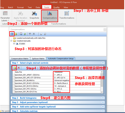 依次調(diào)整好各單管Control的Marker門的位置。此處不一一列舉?;氐窖a償界面。此處的3、4適用于使用補償beads調(diào)節(jié)補償?shù)那闆r(由于本次數(shù)據(jù)為細胞,此處不詳細列出,如對此步驟感興趣,可咨詢小達君)