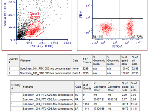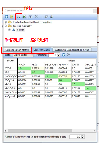出現(xiàn)補償編輯欄,從PE通道中去除FITC的熒光信號,使PE通道的Mean/Median值與陰性細胞群一致。
