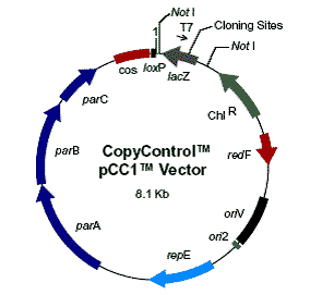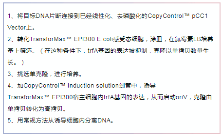 pCC1和pCC2載體含有兩個(gè)復(fù)制起始位點(diǎn):?jiǎn)慰截惖拇竽c桿菌F-因子復(fù)制子和誘導(dǎo)型的高拷貝oriV。其中OriV的啟動(dòng),需要trfA基因產(chǎn)物,由CopyControl?的另一個(gè)重要成分——TransforMax? EPI300 E.coli菌株提供。