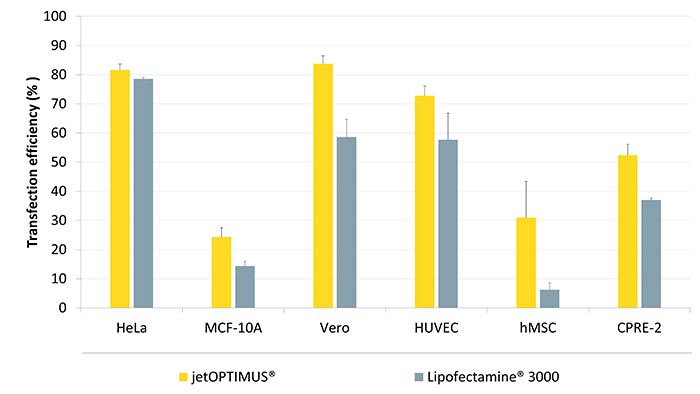 △圖1. jetOPTIMUS?有效提高難轉(zhuǎn)細(xì)胞的轉(zhuǎn)染效率。根據(jù)L3K和jetOPTIMUS?說(shuō)明書(shū)要求進(jìn)行轉(zhuǎn)染,在24孔板中轉(zhuǎn)染GFP質(zhì)粒到多種細(xì)胞系,24小時(shí)后采用FACS檢測(cè)轉(zhuǎn)染效率。