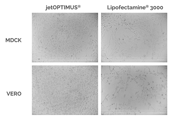 △圖2. 使用jetOPTIMUS?轉(zhuǎn)染24小時(shí)后,細(xì)胞仍然健康并保持良好形態(tài)。根據(jù)L3K和jetOPTIMUS?說(shuō)明書(shū)要求進(jìn)行轉(zhuǎn)染,24小時(shí)后在相差顯微鏡下觀(guān)察MDCK和VERO細(xì)胞的狀態(tài)。