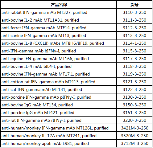 Mabtech除了ELISpot、ELISA相關(guān)檢測產(chǎn)品外,還提供人、小鼠等多種指標(biāo)的中和抗體;并且Mabtech的中和抗體均為單克隆抗體,不含疊氮化鈉,且內(nèi)毒素含量均低于10 EU/mg。