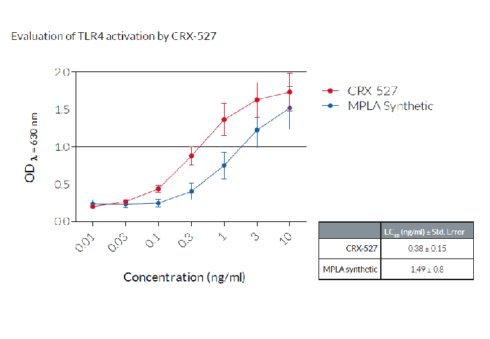 將細胞分別與遞增濃度的CRX-527、合成的單磷酰脂質(zhì)A(MPLA)孵育。在HEK-BlueTM檢測培養(yǎng)基(SEAP檢測生長培養(yǎng)基)中孵育過夜后,通過測定上清液中是否存在SEAP來評估TLR4的活化。數(shù)據(jù)表示為OD(λ=630nm)(±SEM)