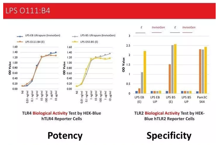 比較InvivoGen和E品牌TLR4特異性LPS(Utrapure)發(fā)現(xiàn),E品牌雖然號稱TLR4 specific agonist,但是可同時激活TLR2和TLR4,而InvivoGen的Ultrapure LPS只能特異性激活TLR4。