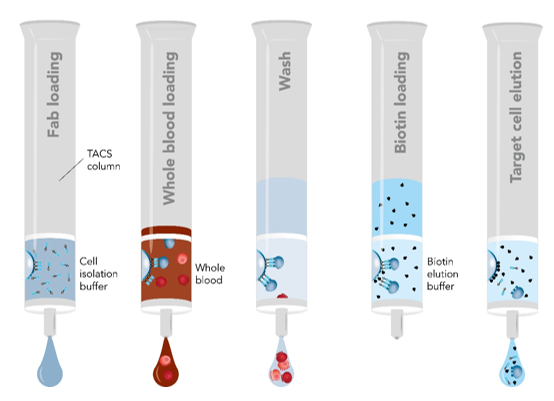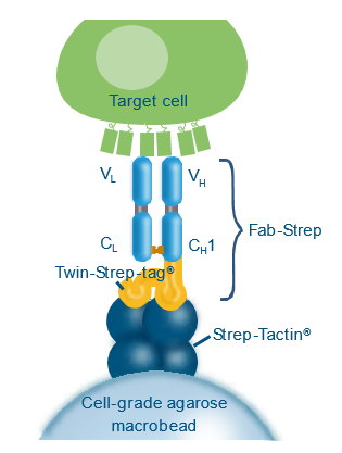 Fab-TACS柱子填充了包被有Strep-Tactin? 多聚體的細胞級瓊脂糖基質(zhì),偶聯(lián)上Strep-tag的Fab片段(Fab-Streps)特異性的結(jié)合到瓊脂糖基質(zhì)上。隨后,加入全血或其他血液制劑流過柱子。目的細胞通過特異性的與Fab-Streps作用從而結(jié)合到瓊脂糖基質(zhì)上,其他非目的細胞則有效的被洗去。最后,加入生物素使目的細胞從Fab-Streps上解離。至此,就已分離得到不帶任何標記的、真實的目的細胞可用于下游的實驗研究。