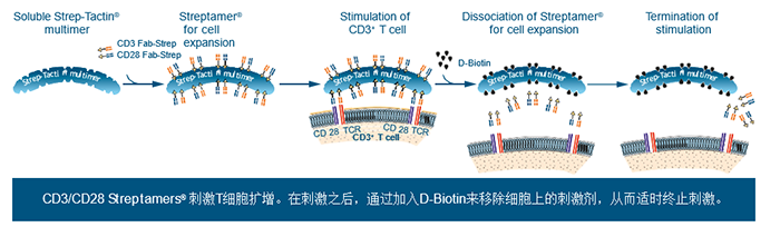 Streptamers?應用于T細胞擴增是目前T細胞擴增術(shù)中一項較新穎的技術(shù)。該技術(shù)的核心在于:將抗CD3和抗CD28的Fab-Streps結(jié)合到Strep-Tactin? 多聚體上,使它們形成可溶性的蛋白復合物。在刺激之后,通過加入D-Biotin來移除細胞上的刺激劑,從而適時終止刺激。