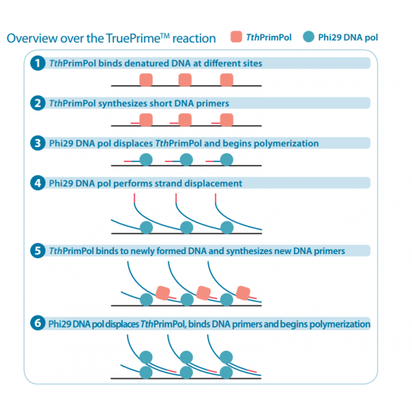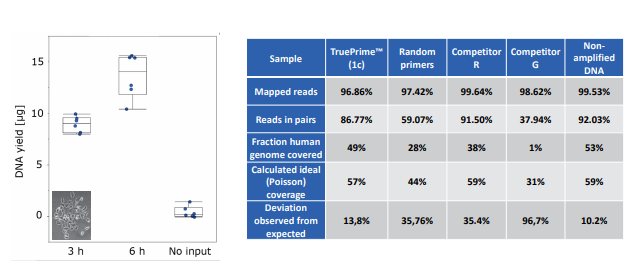TruePrime?采用MDA技術(shù),基于新型的TthPrimPol 引物酶和Phi29 DNA聚合酶,擴(kuò)增過程無需添加隨機(jī)引物,減少了擴(kuò)增偏倚,提高了擴(kuò)增過程的覆蓋率和保真性,并且對(duì)于污染的外源DNA不敏感,可重復(fù)性好。TruePrime?可用于單個(gè)細(xì)胞或少量細(xì)胞的全基因組擴(kuò)增,與常見的NGS平臺(tái)如Illumina和IonTorrent等兼容性良好。