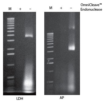 來自于大腸桿菌表達(dá)的LDH和AP的細(xì)胞裂解樣品用OmniCleave? Endonuclease處理或不加核酸酶處理。各取2 μl細(xì)胞裂解液進(jìn)行1%瓊脂糖電泳,核酸EB染色;泳道M,1 kb ladder。