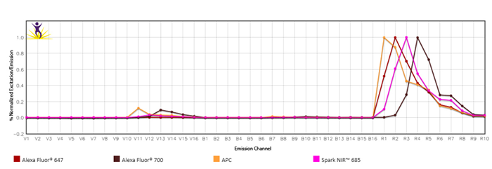 由于近紅外(NIR)范圍內(nèi)的熒光發(fā)射光譜以及光電倍增管(PMT)對800nm以上發(fā)射波長的不敏感性,633nm紅色激光器僅限于2-3個(gè)熒光。借助全光譜流式細(xì)胞儀,APC和AlexaFluor?700的發(fā)射峰之間的光譜間隙可檢測Spark NIR?685等新型熒光。Spark NIR?685可被633 nm激發(fā),最大發(fā)射波長為685 nm,與FITC具有相似的亮度。