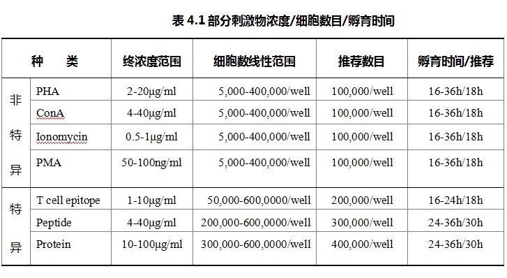 不論是普通多肽(比如重疊多肽庫)還是蛋白質(zhì)或者蛋白類的組織提取物,這些刺激物都需要APC的攝取、內(nèi)化、加工、呈遞,之后T細(xì)胞才能被刺激。所以,使用這些刺激物的時候,一定要保證足夠的細(xì)胞密度。根據(jù)我們的經(jīng)驗,細(xì)胞密度要至少達(dá)到20萬-30萬每孔。多肽推薦的細(xì)胞密度為30萬/孔,蛋白推薦的細(xì)胞密度為40萬/孔。也可以根據(jù)實際情況,在線性范圍內(nèi)調(diào)整,參見表4.1與圖4.2。