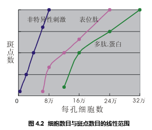 非特異性的刺激物可以直接刺激淋巴細(xì)胞,這種刺激不依賴于APC或者其它輔助細(xì)胞,是單細(xì)胞反應(yīng)行為。所以它對細(xì)胞密度沒有要求,在極寬的細(xì)胞濃度范圍之內(nèi)——多至40萬/孔,低至5千/孔——斑點數(shù)量和細(xì)胞數(shù)量都有簡單的正比例關(guān)系,參見圖4.2。但是考慮到,只有恰當(dāng)?shù)陌唿c數(shù)目才便于數(shù)據(jù)統(tǒng)計,所以推薦細(xì)胞密度為10萬/孔。如果細(xì)胞數(shù)目過多,滿孔都會被斑點覆蓋,并且相互重疊。