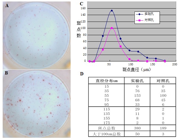 由于有了充足的信息與理由,我們可以在最后斑點計數(shù)的時候,把斑點直徑的閾值設定為100μm:我們只計數(shù)大于100μm的斑點,小于100μm的斑點不予計數(shù)。這樣負對照孔與實驗孔的最終結(jié)果為3:50,相差有17倍!這比最初相差一倍的結(jié)果顯著得多。