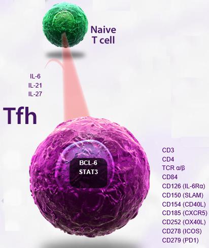 主要標(biāo)記物:Tfh 細(xì)胞屬于 CD4+ T 細(xì)胞亞群,其表型特征為 CXCR5+CD40LhiICOShi ,并且還表達(dá)細(xì)胞因子 IL-21 和轉(zhuǎn)錄因子 Bcl-6 。 IL-21 和 Bcl-6 ( B-cell lymphoma 6 )對于 Tfh 細(xì)胞的發(fā)生和發(fā)育至關(guān)重要。其中 IL-21 誘導(dǎo) Tfh 的分化并促進(jìn)其表面 CXCR5 的表達(dá); Bcl-6 對于 Tfh 轉(zhuǎn)移到淋巴濾泡和 B 細(xì)胞發(fā)生中心( Germinal center )的形成必不可少。