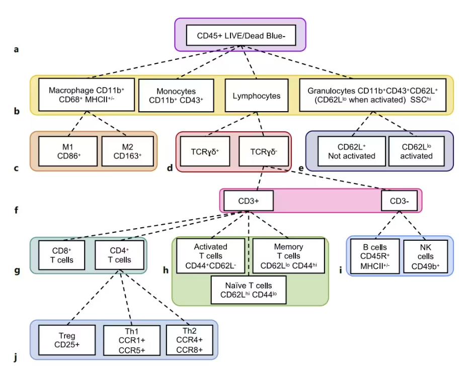 大鼠模型是生物醫(yī)學研究中重要的資源,因與人類免疫系統(tǒng)相似,而常被用于免疫相關(guān)的功能研究。然而目前小鼠模型在基礎(chǔ)和機制免疫學研究中占主導地位,相對缺乏對大鼠模型中免疫細胞的流式分析鑒定。本文將分享對大鼠常見免疫細胞的流式鑒定方案,鑒定分析不同組織中的粒細胞、巨噬細胞、T細胞、B細胞及NK細胞。