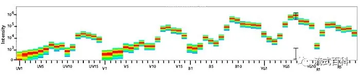 為了解決這個(gè)問題,光譜流式的技術(shù)在借鑒傳統(tǒng)流式技術(shù)的基礎(chǔ)上應(yīng)運(yùn)而生,通過分析每個(gè)熒光素的光譜特征區(qū)別不同的熒光素,即使發(fā)射波長相似的熒光素如APC和AF647,由于其波形不同,在光譜流式中也能很好的解析開,可消除傳統(tǒng)流式中熒光間補(bǔ)償?shù)睦_,另外通過對特異性光譜的分析可以方便的消除自發(fā)熒光信號的干擾。因此,光譜流式相對于傳統(tǒng)流式來說可以同時(shí)檢測更多的參數(shù),那么適配光譜流式的熒光素的開發(fā)是這項(xiàng)技術(shù)發(fā)展的核心。