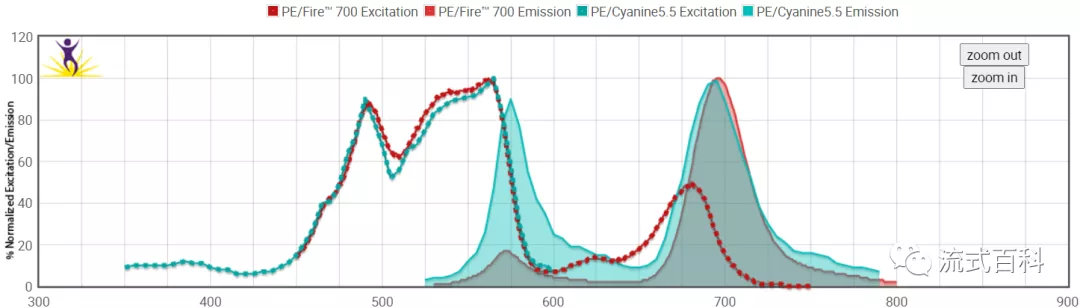 很顯然,在傳統(tǒng)的流式平臺PE/Fire? 700和PE/Cyanine5.5是不可以使用在同一個(gè)panel中的,但是在光譜流式中,兩種熒光染料由于其光譜特性存在一定的差異,是可以區(qū)分開: