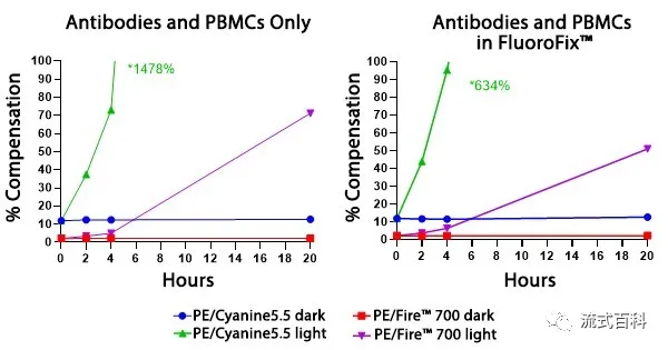 PE/Fire? 700 和PE/Cyanine5.5標(biāo)記的兩種CD4抗體檢測人PBMC,無論在避光條件下還是暴露在熒光的條件下,PE/Fire? 700的穩(wěn)定性要優(yōu)于PE/Cyanine5.5(檢測平臺為5激光Cytek? Aurora 光譜流式)。