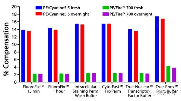 PE/Fire? 700 和PE/Cyanine5.5標(biāo)記的兩種CD4抗體檢測人裂紅外周血,抗體孵育完成后在固定洗滌馬上去檢測條件下和過夜后的條件下,在5激光Cytek? Aurora 光譜流式平臺檢測,PE/Fire? 700 在不同的實(shí)驗(yàn)方案中對多聚甲醛的固定具有穩(wěn)定的抗性,表現(xiàn)出比PE/Cyanine5.5更優(yōu)秀的穩(wěn)定性,但是在磷酸化指標(biāo)的檢測方案中,PE/Fire? 700熒光素的穩(wěn)定性出現(xiàn)了一定程度的下降。
