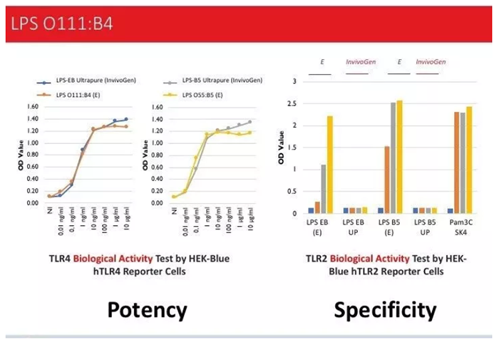 比較InvivoGen和E品牌TLR4特異性LPS(Utrapure)發(fā)現(xiàn),E品牌雖然號稱TLR4 specific agonist,但是可同時(shí)激活TLR2和TLR4,而InvivoGen的Ultrapure LPS只能特異性激活TLR4。